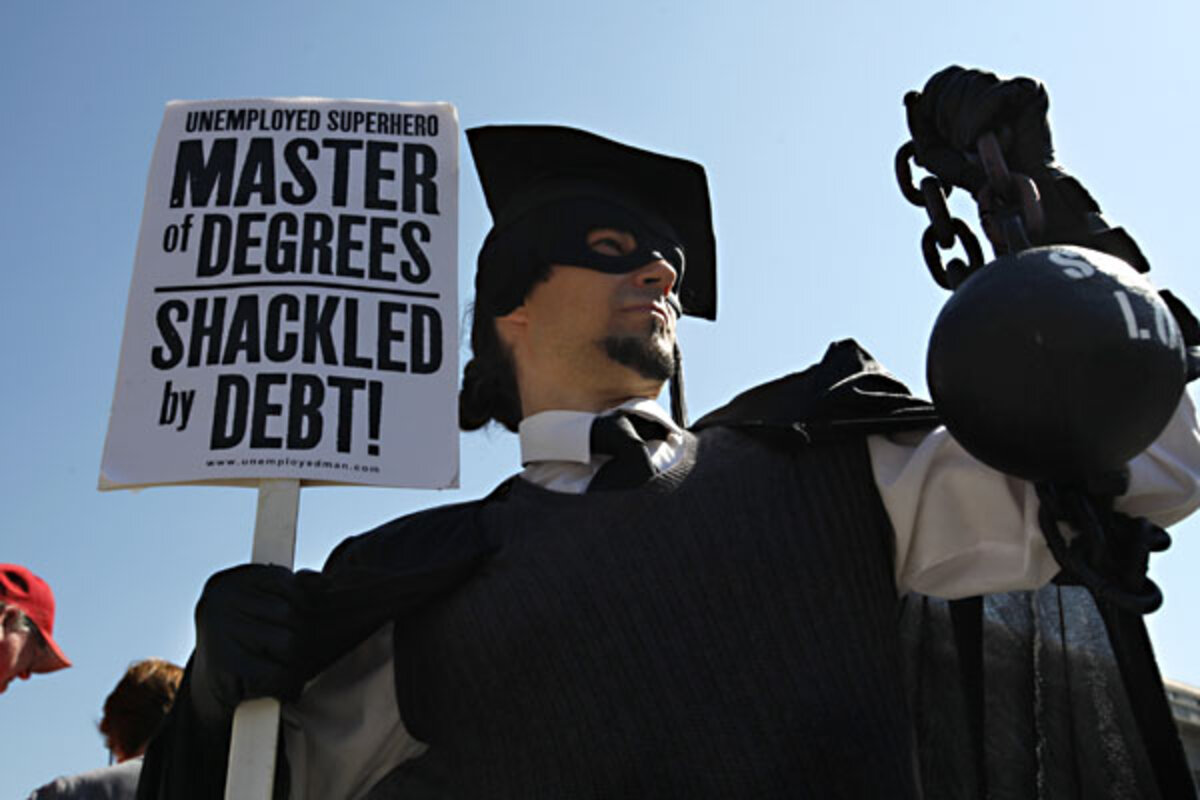 Because of the sluggish economy, fewer college聽students聽than before are able to settle into full-time careers immediately upon graduation, contributing to a jump in聽debt聽among lower-income households as the young adults take on part-time jobs or attend graduate school, according to Pew.