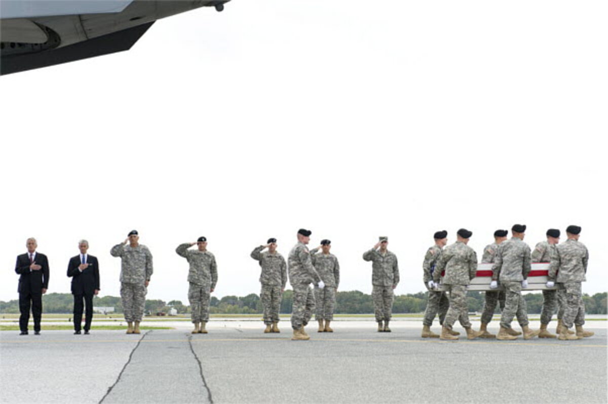 Hagel put his hand over his heart as white-gloved soldiers carried the flag-draped case carrying Patterson's remains from a C-17 cargo plane to a white panel truck for transfer to the Dover mortuary.
