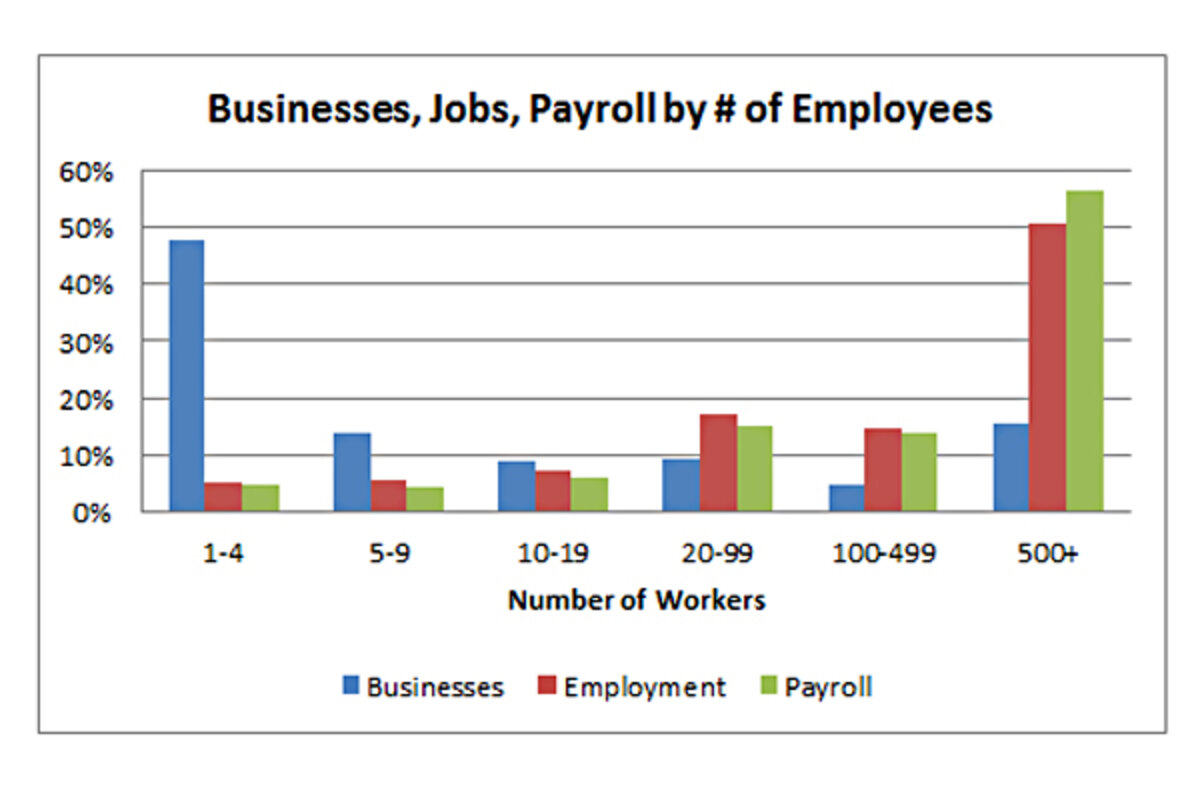 Payroll (total compensation) is even more skewed: 57% is paid out by firms of 500 or more workers; only 30% of payroll is paid by firms of less than 100 workers.