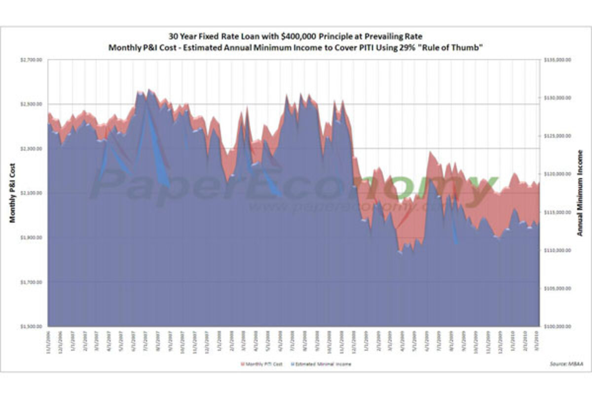 The following chart shows how the principle and interest cost and estimated annual income required to cover the PITI (using the 29% 鈥渞ule of thumb鈥) on a $400,000 loan has changed since November 2006.