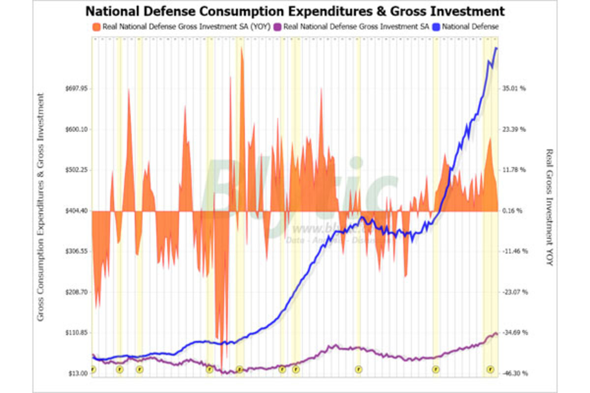 In nominal terms, national defense consumption expenditures and gross investment was $793.8 billion in Q3 2009, a 113% increase over the same period in 2000, a decade long run of robust defense spending.