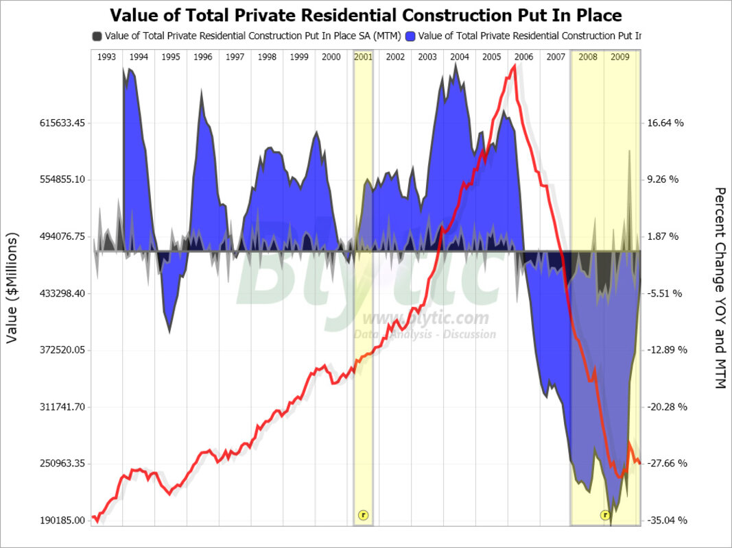 show private residential construction spending, private residential single family construction spending and private non-residential construction spending broken out and plotted since 1993 along with the year-over-year and peak percent change to each since 1994 and 2000 鈥 2005.