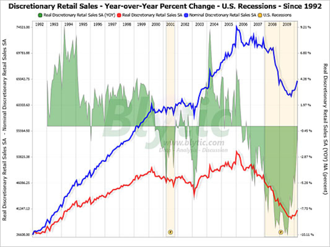 Adjusting for inflation, 鈥渞eal鈥 discretionary retail sales declined 1.18% since March 2009.