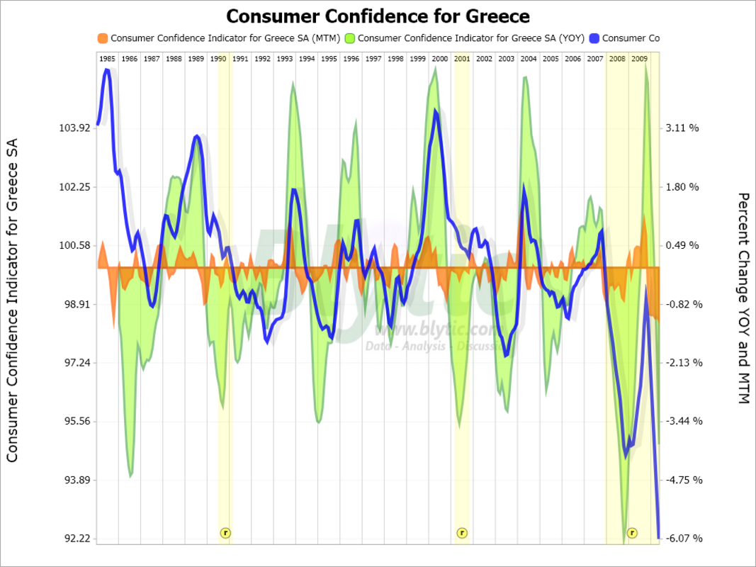 Looking at the , Greece makes by far in all the Eurozone while further appearing to be clearly quickly collapsing into recession.