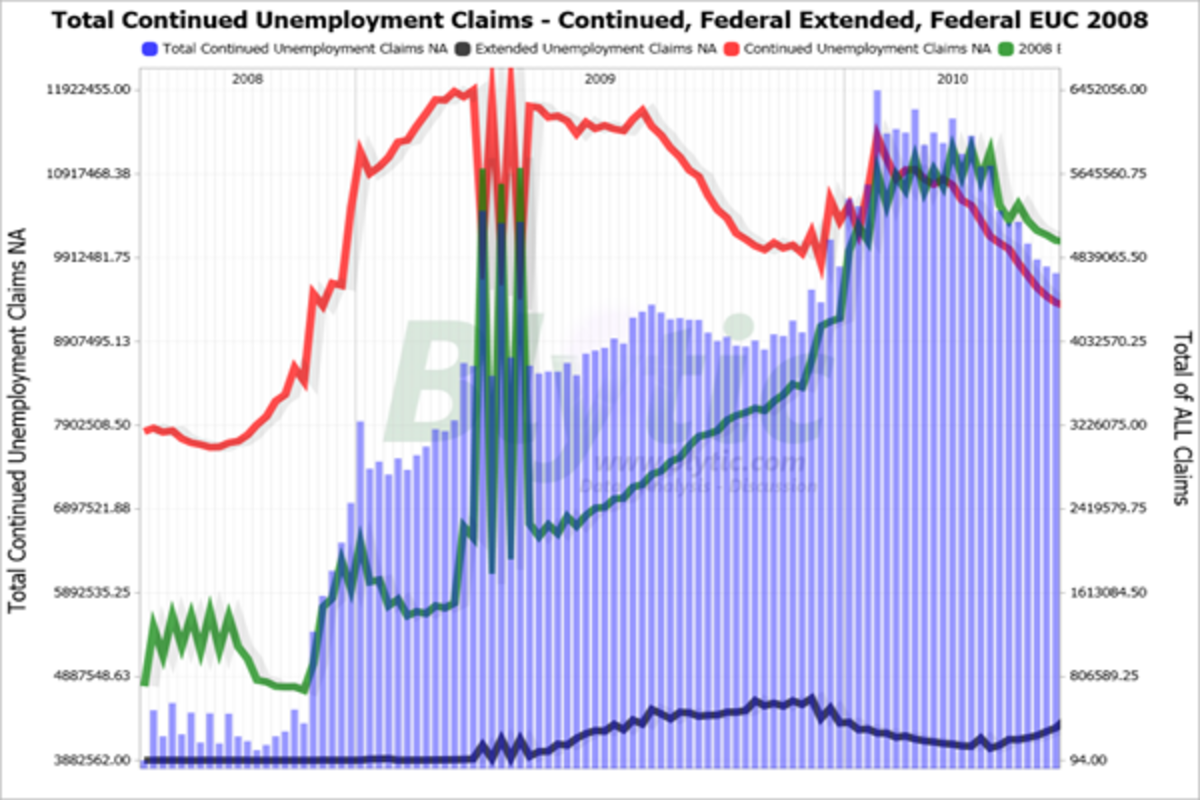Since the middle of 2008 though, two federal government sponsored 鈥渆xtended鈥 unemployment benefit programs (the 鈥渆xtended benefits鈥 and 鈥淓UC 2008鈥 from recent legislation) have been picking up claimants that have fallen off of the traditional unemployment benefits rolls.