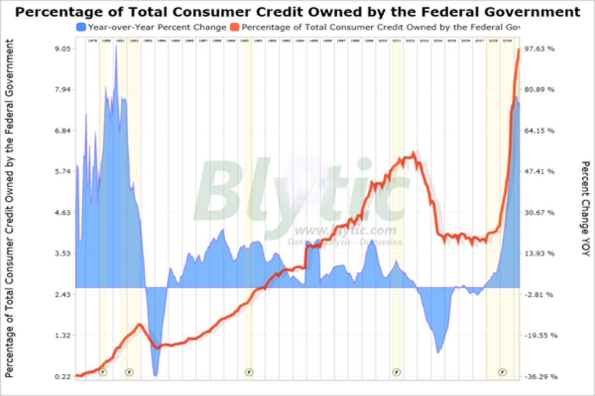 It鈥檚 currently just over 9%... that鈥檚 up over 75% just the last 12 months鈥. so 9% of all consumer credit has been brought about by the good graces of our representatives in Washington鈥 aren鈥檛 we all just so lucky?