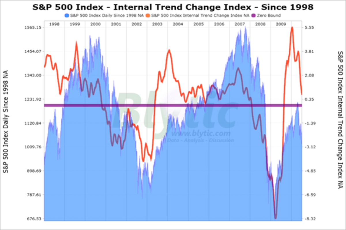 Looking at an interesting internal trend indicator of the S&P 500 you can see that although the overall market appears dangerously nearing a topping formation, the bear trend has a bit more development yet to go before reaching near certainty.