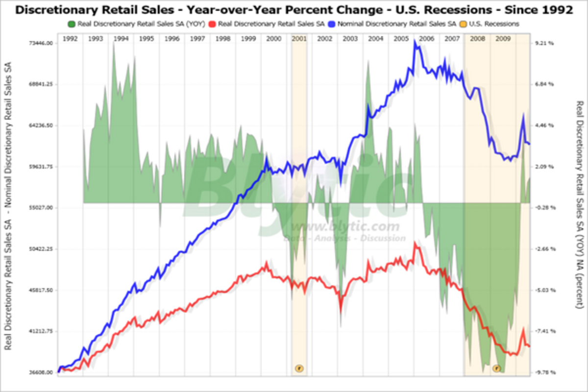 Discretionary retail sales including home furnishings, home garden and building materials, consumer electronics and department store sales, on the other hand, declined 0.42% from June but remained 2.77% compared to July 2009 while, adjusting for inflation, 鈥渞eal鈥 discretionary retail sales increased just 1.44% over the same period.