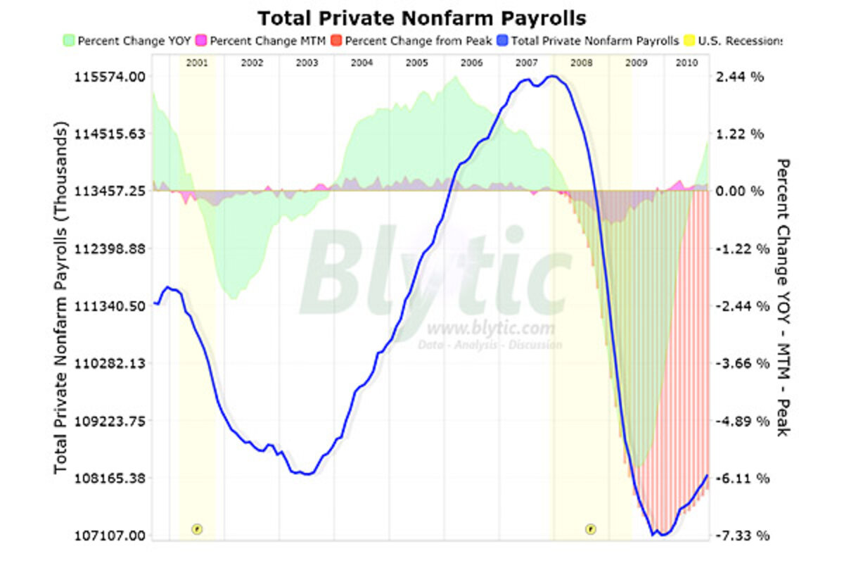 It's important to note that private sector job creation increased 0.15% since last month remaining a whopping 6.36% below the peak level of employment seen in December 2007 though, on a year-over-year basis, private jobs showed a second notable increase of 1.03%.