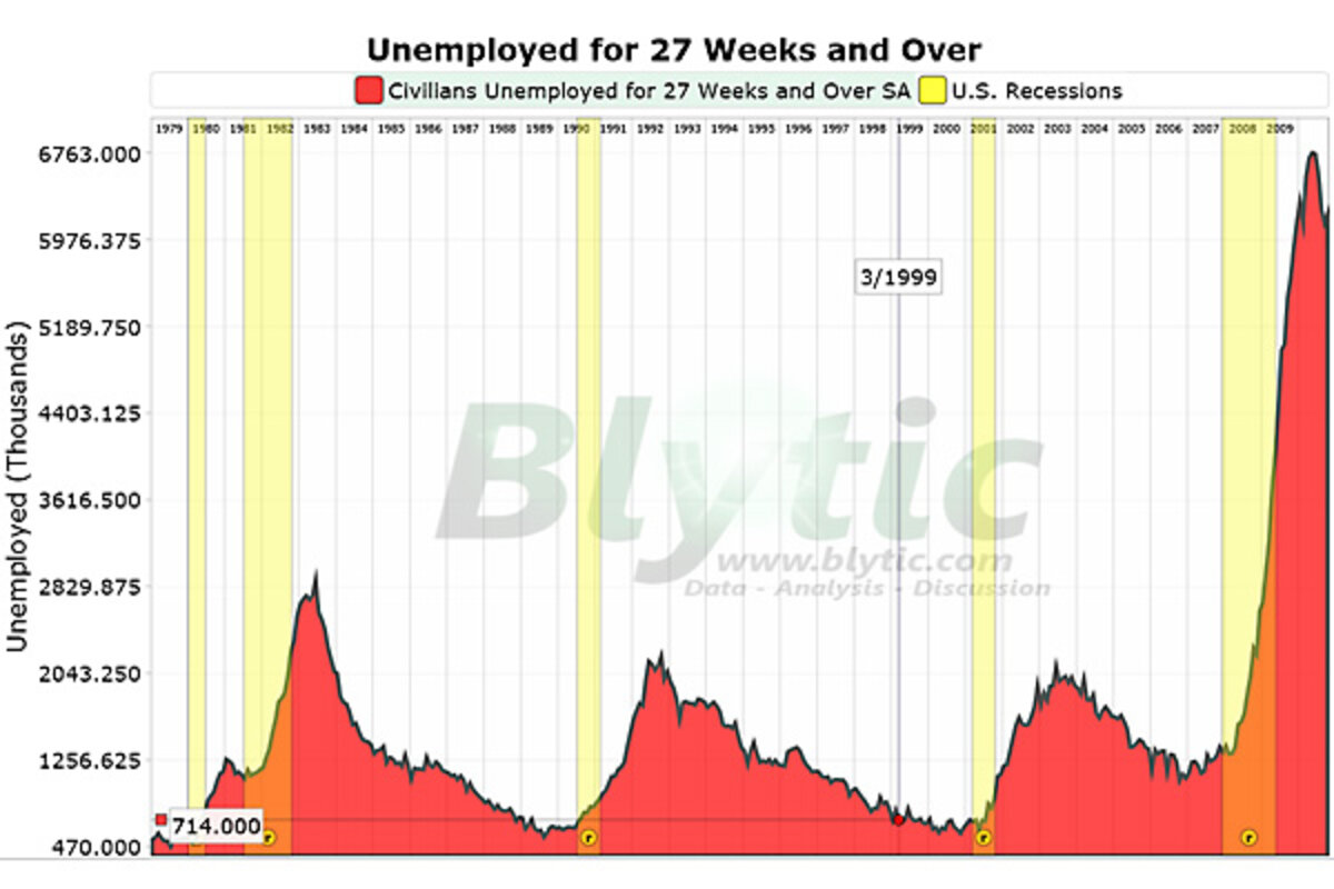 Workers unemployed 27 weeks or more increase to 6.206 million or 41.8% of all unemployed workers while the median number of weeks unemployed increased to 21.20 weeks and the average stay on unemployment increased to 33.9 weeks.