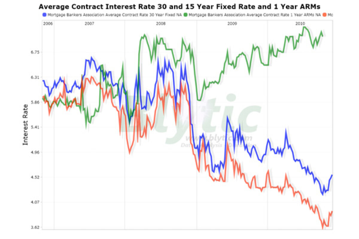 The following chart shows the average interest rate for 30 year and 15 year fixed rate mortgages as well as one year ARMs since 2006 (click for larger dynamic full-screen version).
