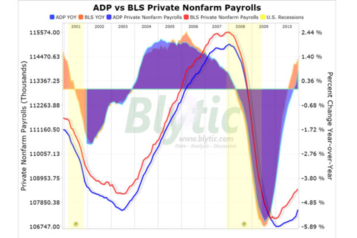 Comparing the private nonfarm payroll estimate from ADP, a national staffing and business services firm, to the BLS results, you can see that while an unusual divergence had shaped up over 2010, ADP appears to be closing the gap as of late.