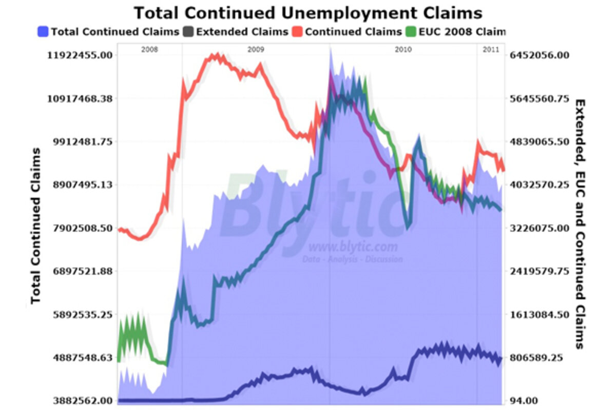 Since the middle of 2008 though, two federal government sponsored 鈥渆xtended鈥 unemployment benefit programs (the 鈥渆xtended benefits鈥 and 鈥淓UC 2008鈥 from recent legislation) have been picking up claimants that have fallen off of the traditional unemployment benefits rolls.