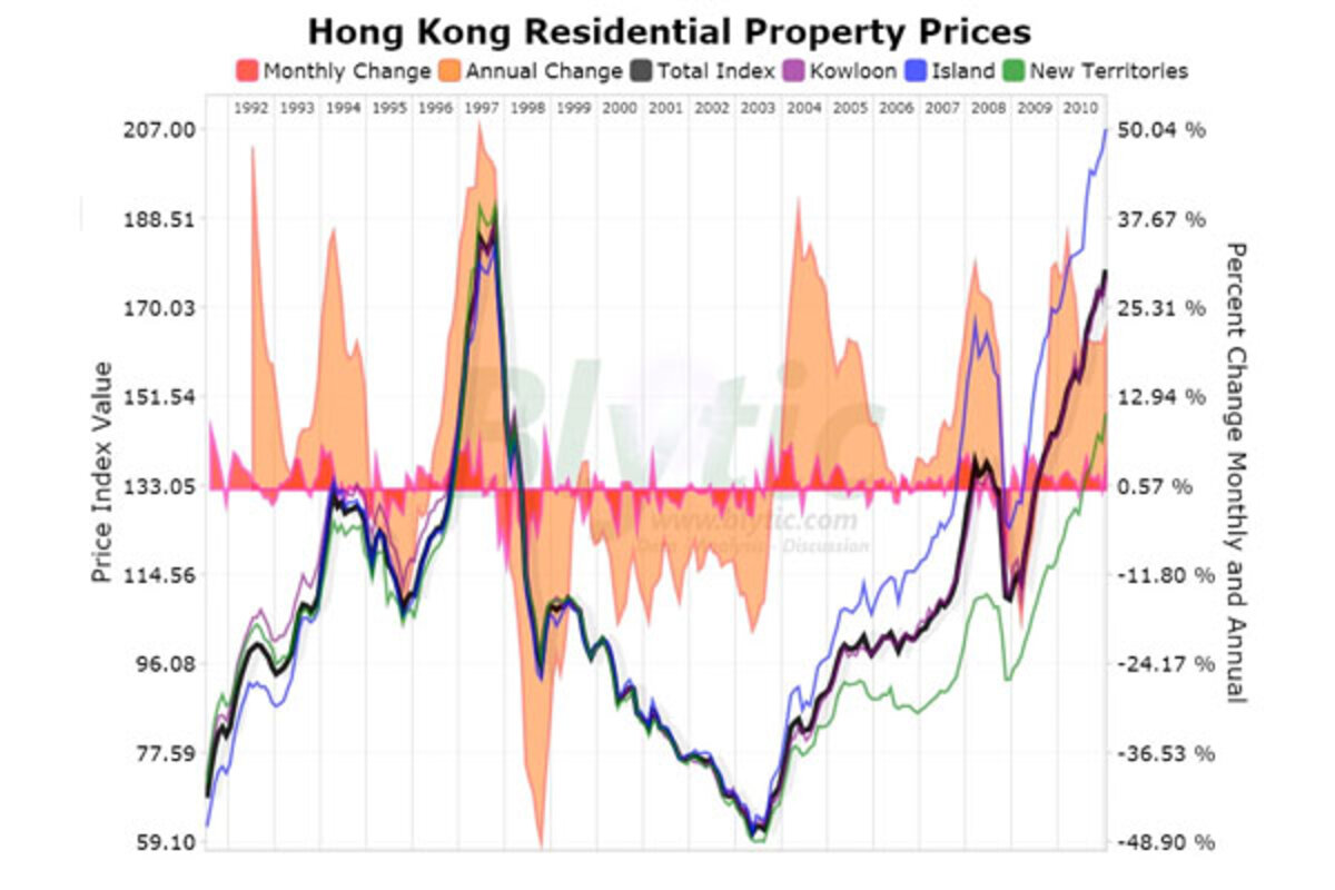 The 鈥Hong Kong Island鈥 index, 鈥Kowloon鈥 and 鈥淣ew Territories鈥 sub-components also showed notable year-over-year increases with "New Territories" outpacing the pack with notable 4.15% monthly increase while the "Hong Kong Island" series indicated that prices have now far outpaced the prior 1997 peak.