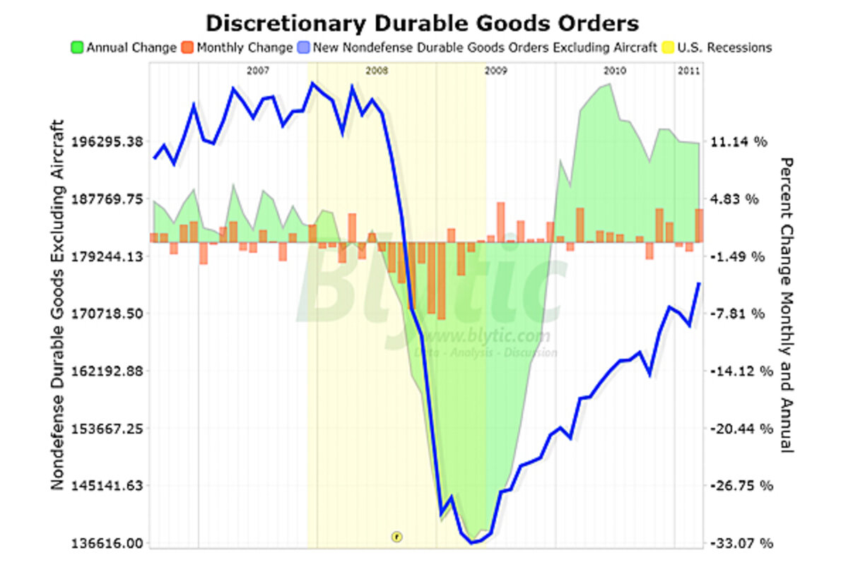 Looking at the latest data for March (less timely data), "discretionary" durable goods orders increased notably jumping 3.72% since February climbing 10.91% above the level seen in March 2010.