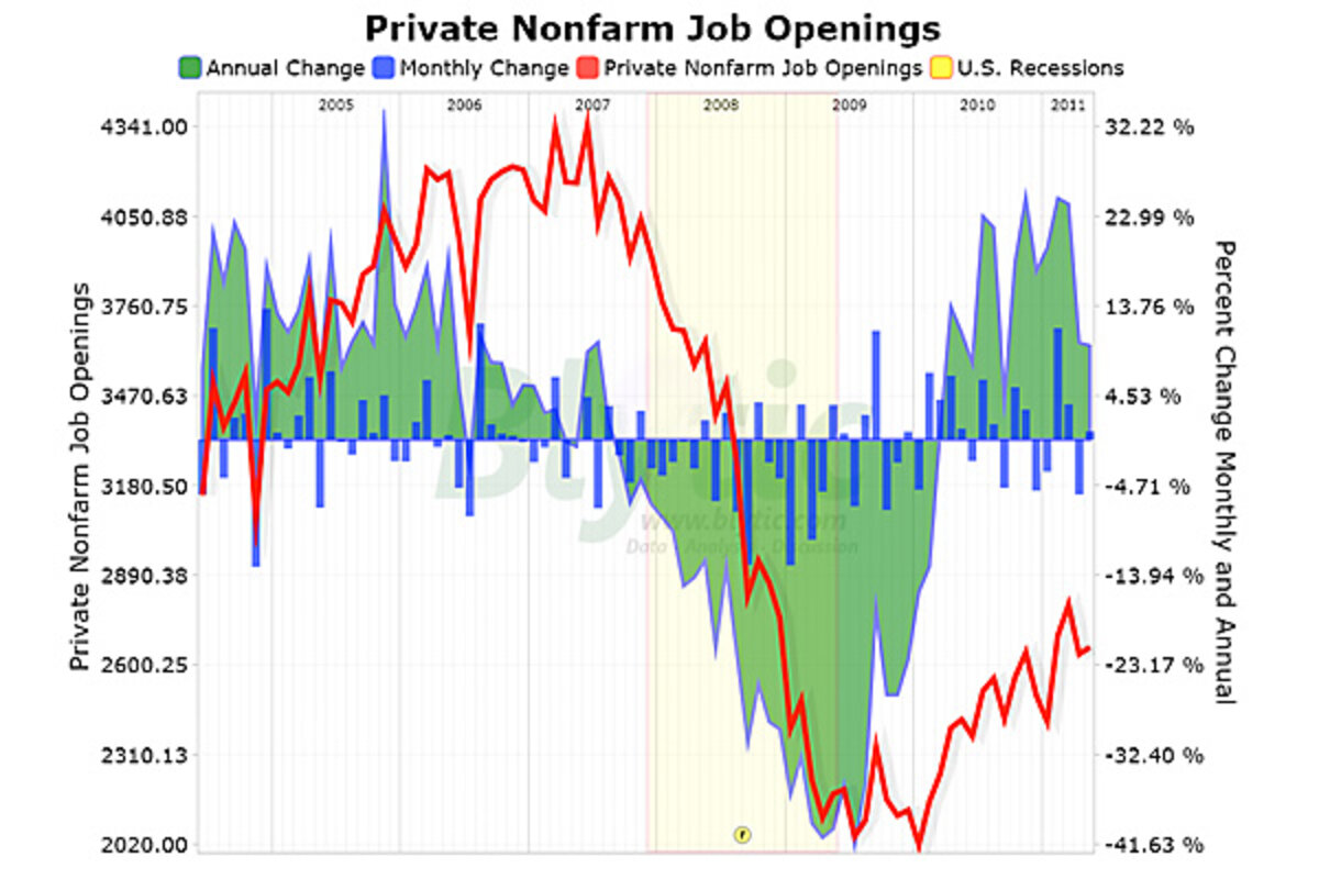 Yesterday, the (JOLT) showing that private non-farm job 鈥渙penings鈥 increased slightly rising 0.83% since April and climbing 9.66% above the level seen in May 2010 while private non-farm job 鈥渉ires鈥 increased 1.71% from April and 5.09% above the level seen in May 2010.