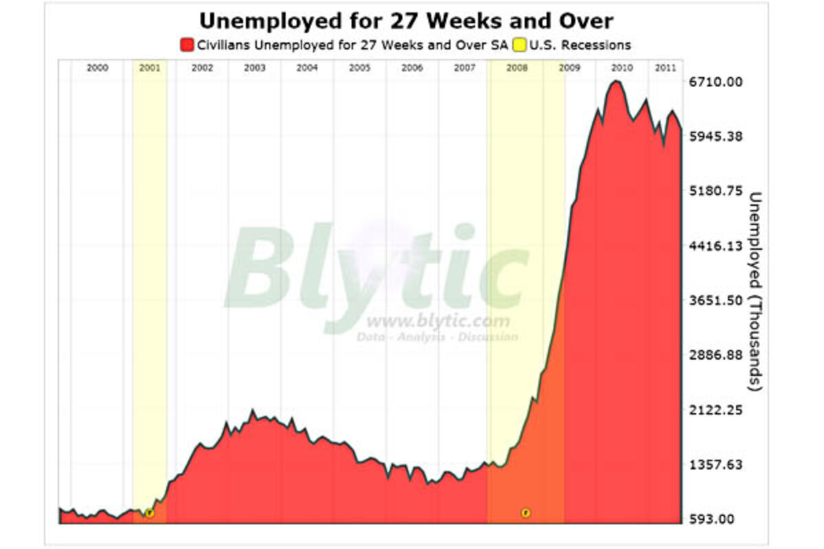 Workers unemployed 27 weeks or more declined to 6.03 million or 42.9% of all unemployed workers while the median number of weeks unemployed increased to 21.8 weeks and the average stay on unemployment declined slightly to 40.3 weeks, a new high for the series.