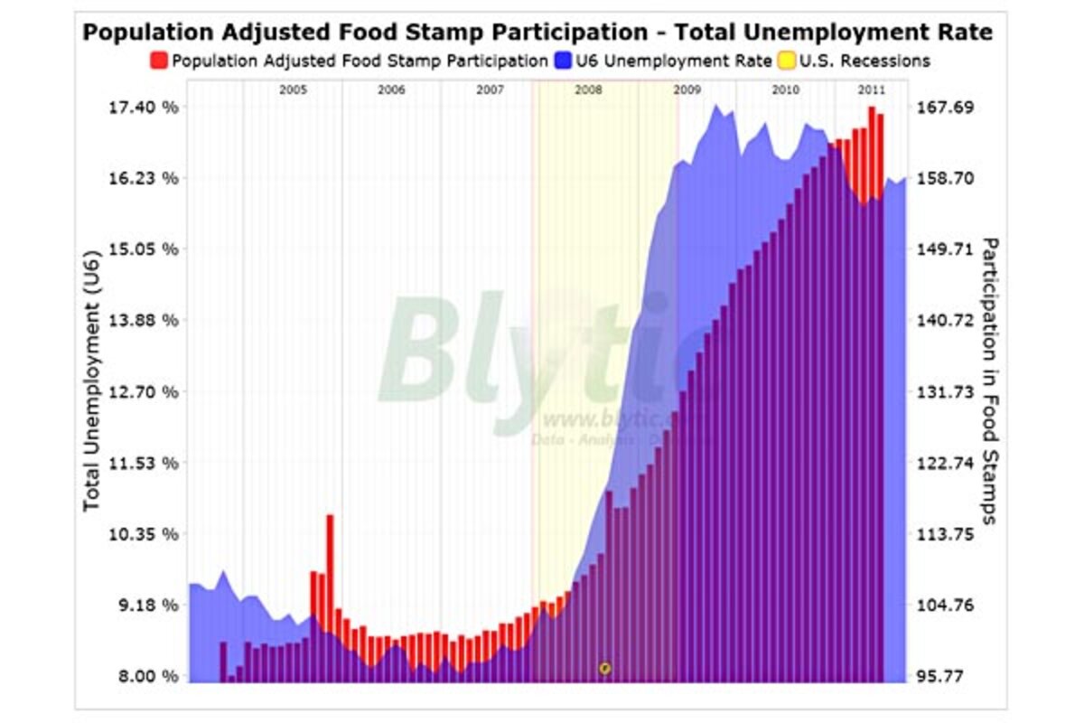 The latest shows that in June, 226,752 recipients were removed from the food stamps program (latest several months effected by disaster assistance), while participation continued to increased 9.47% on a year-over-year basis and household participation increased 11.76%.