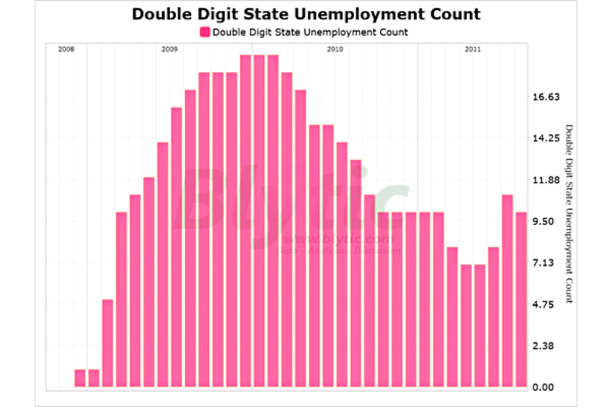 The latest showed that in August 10 states were experiencing double digit unemployment with a median unemployment rate of 10.9% while the median unemployment rate for all 50 states and the District of Columbia stood at 8.3%.