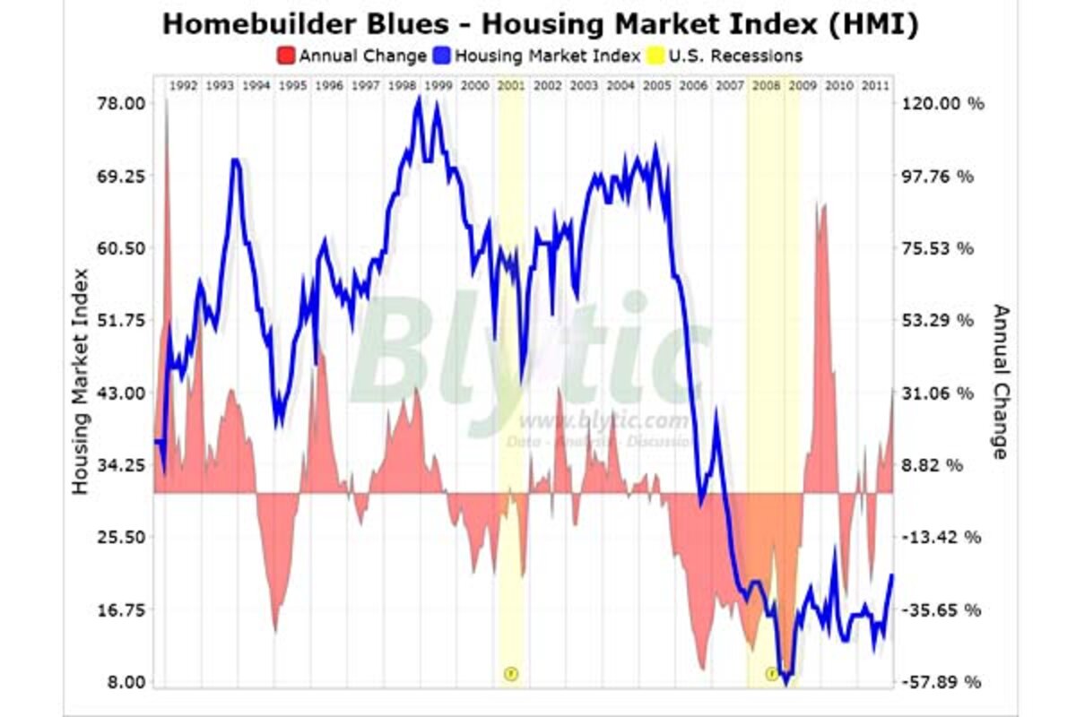 Today, the National Association of Home Builders (NAHB) released their latest Housing Market Index (HMI) showing that all measures increased in December with the composite HMI index climbing to 21 while the "buyer traffic" index climbed from record lows to 19, the highest level seen since May 2008, as home builders continue to plod through the weakest activity seen in generations.