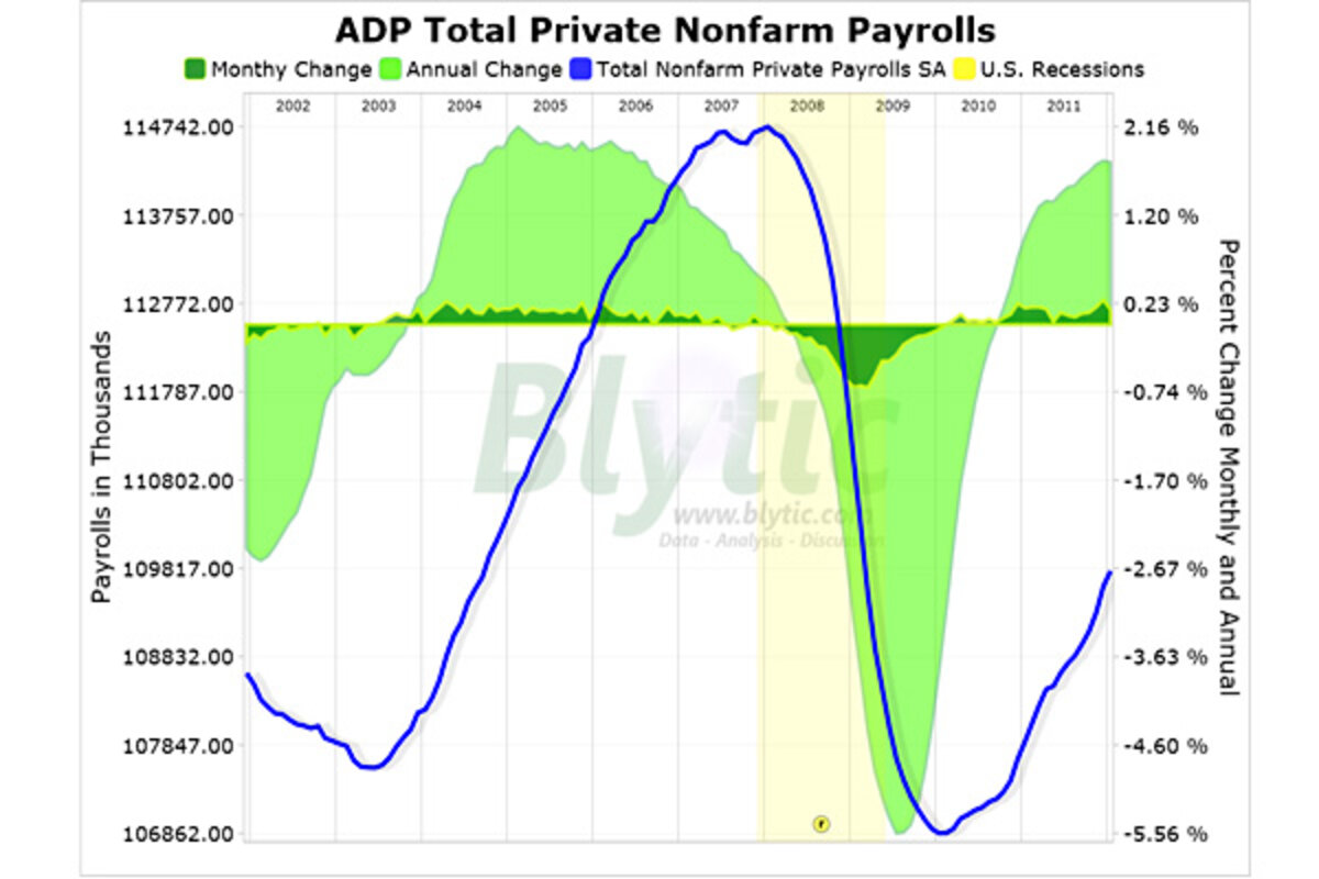 Looking at the chart (click for full-screen dynamic version) showing ADP鈥檚 total private nonfarm payrolls since 2001 as well as the year-over-year and month-to-month percent change, you can see that while the job recovery had been anemic throughout most of 2010, more recently the trend had been picking up momentum.