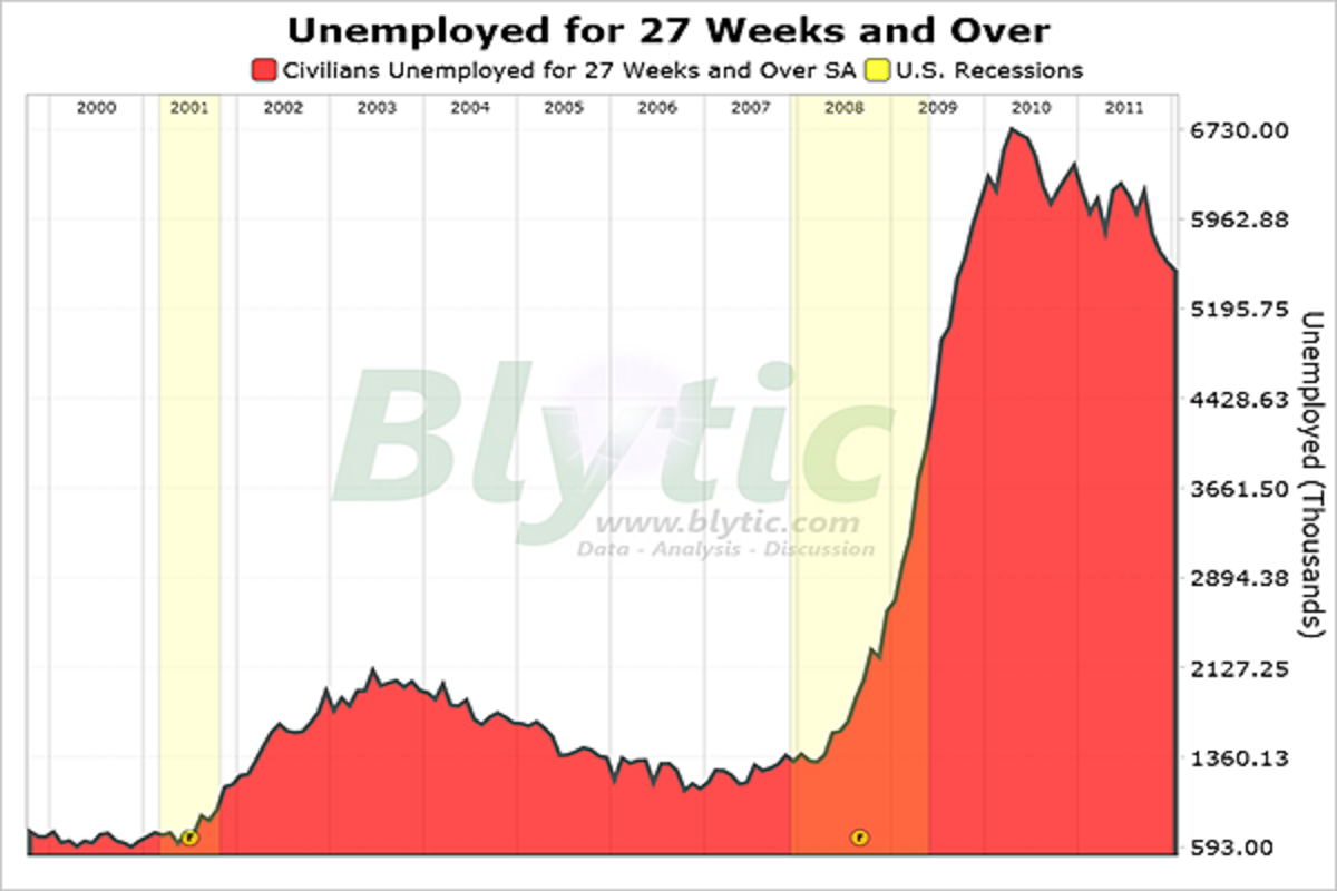 Workers unemployed 27 weeks or more declined to 5.518 million or 42.9% of all unemployed workers while the median number of weeks unemployed increased to 21.1 weeks and the average stay on unemployment declined to 40.1 weeks, the highest level ever recorded.