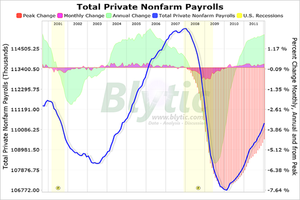 Net private sector jobs increased 0.23% since last month climbing 2.06% above the level seen a year ago but but remained a whopping 4.47% below the peak level of employment seen in December 2007.