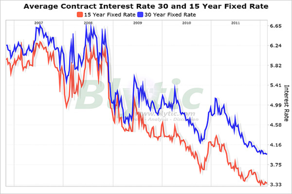 The latest data is showing that the average rate for a 30 year fixed rate mortgage (from FHA and conforming GSE data) went flat at 3.965% since last week while the purchase application volume increased 2.1% and the refinance application declined 2.0% over the same period.