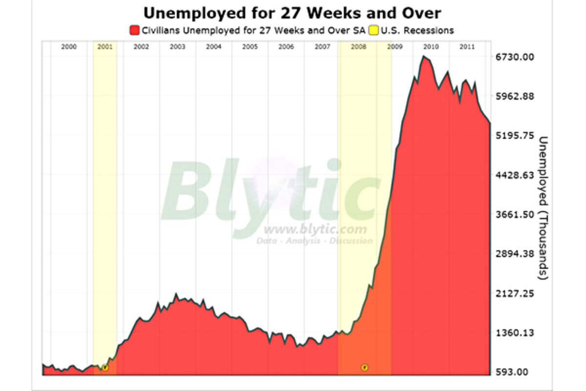 Workers unemployed 27 weeks or more declined to 5.426 million or 42.6% of all unemployed workers while the median number of weeks unemployed increased to 20.3 weeks and the average stay on unemployment declined to 40.0 weeks, the highest level ever recorded.