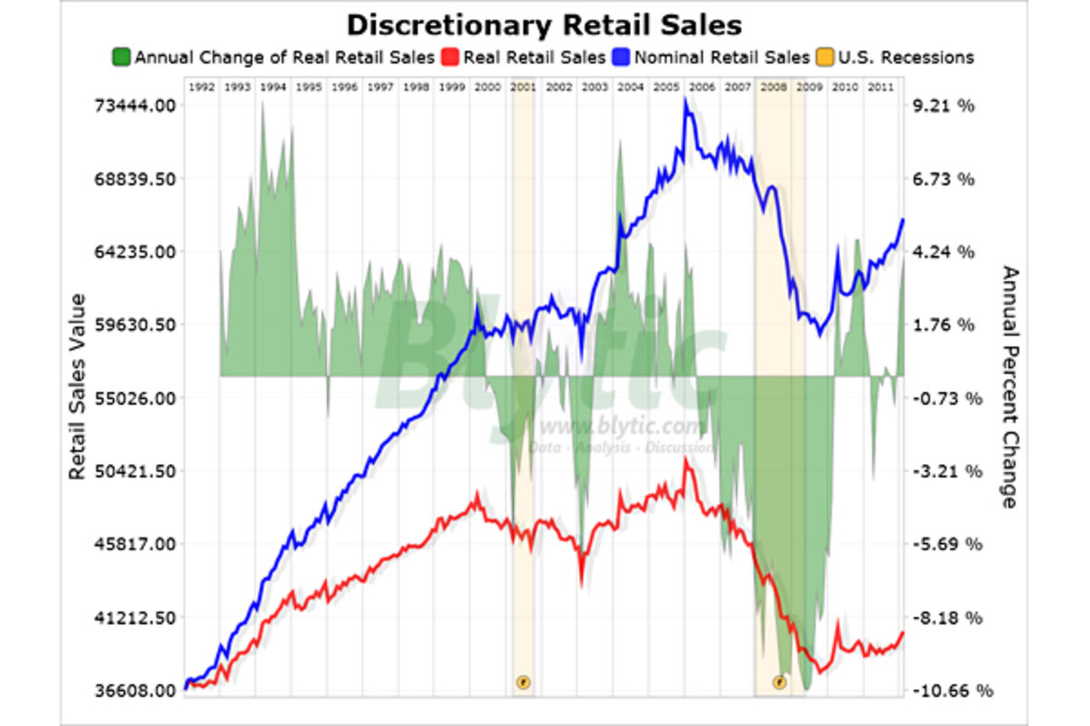 Nominal "discretionary" retail sales including home furnishings, home garden and building materials, consumer electronics and department store sales increased 1.03% from January and increased 3.90% above the level seen in February 2011 while, adjusting for inflation, 鈥渞eal鈥 discretionary retail sales increased 3.90% over the same period.