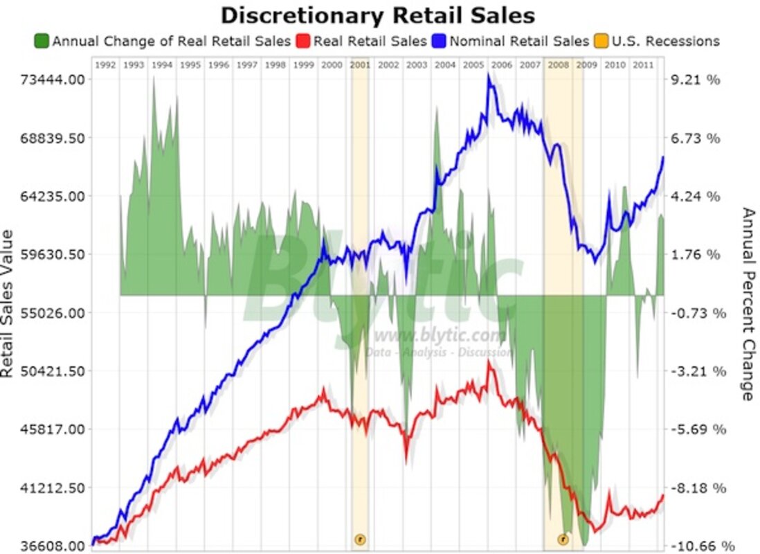 Nominal "discretionary" retail sales including home furnishings, home garden and building materials, consumer electronics and department store sales increased 1.61% from February and increased 5.91% above the level seen in March 2011 while, adjusting for inflation, 鈥渞eal鈥 discretionary retail sales increased 3.23% over the same period.