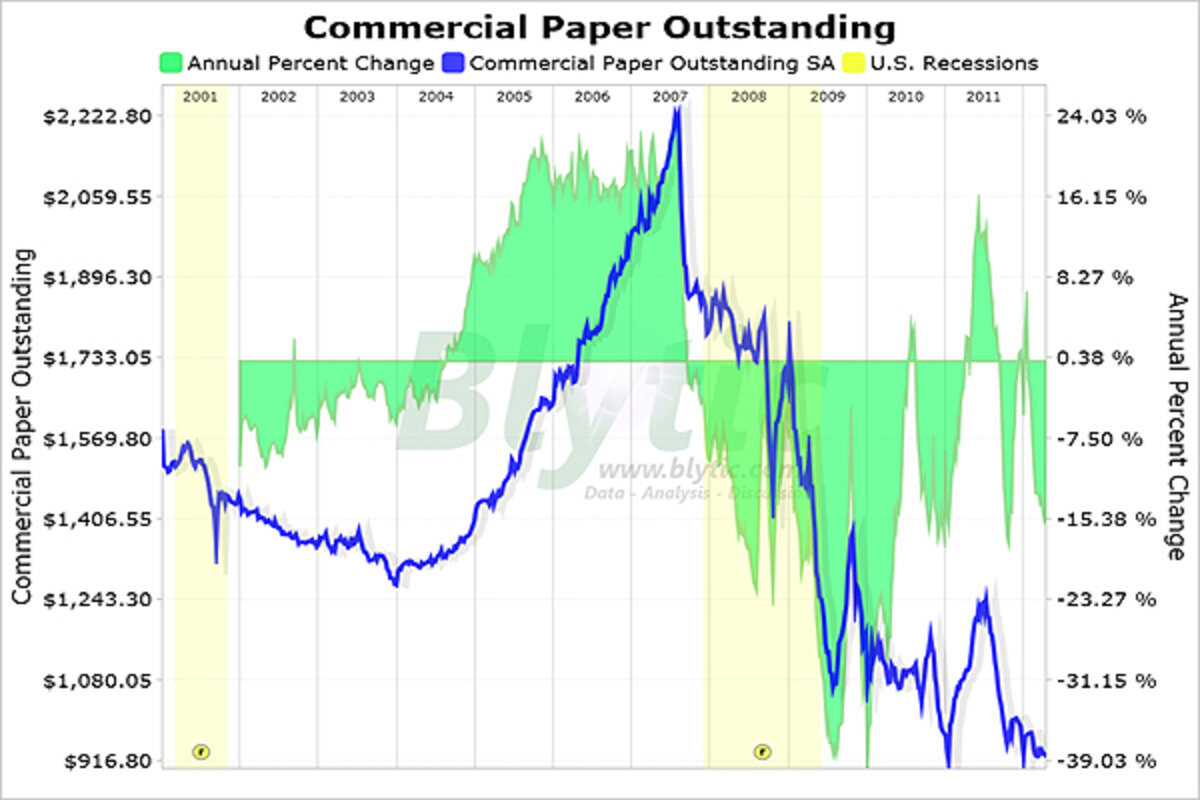 Although the Federal Reserve was able to artificially bring CP rates down significantly since the shocking 615 basis point spread blowout (A2/P2 spread) of late 2008, they had not been successful in preventing an overall contraction in the CP market.