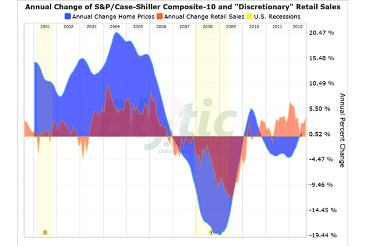 The chart above shows the year-over-year change to nominal discretionary retail sales and the year-over-year change to nominal the S&P/Case-Shiller Composite home price index since 1993 and since 2000.聽