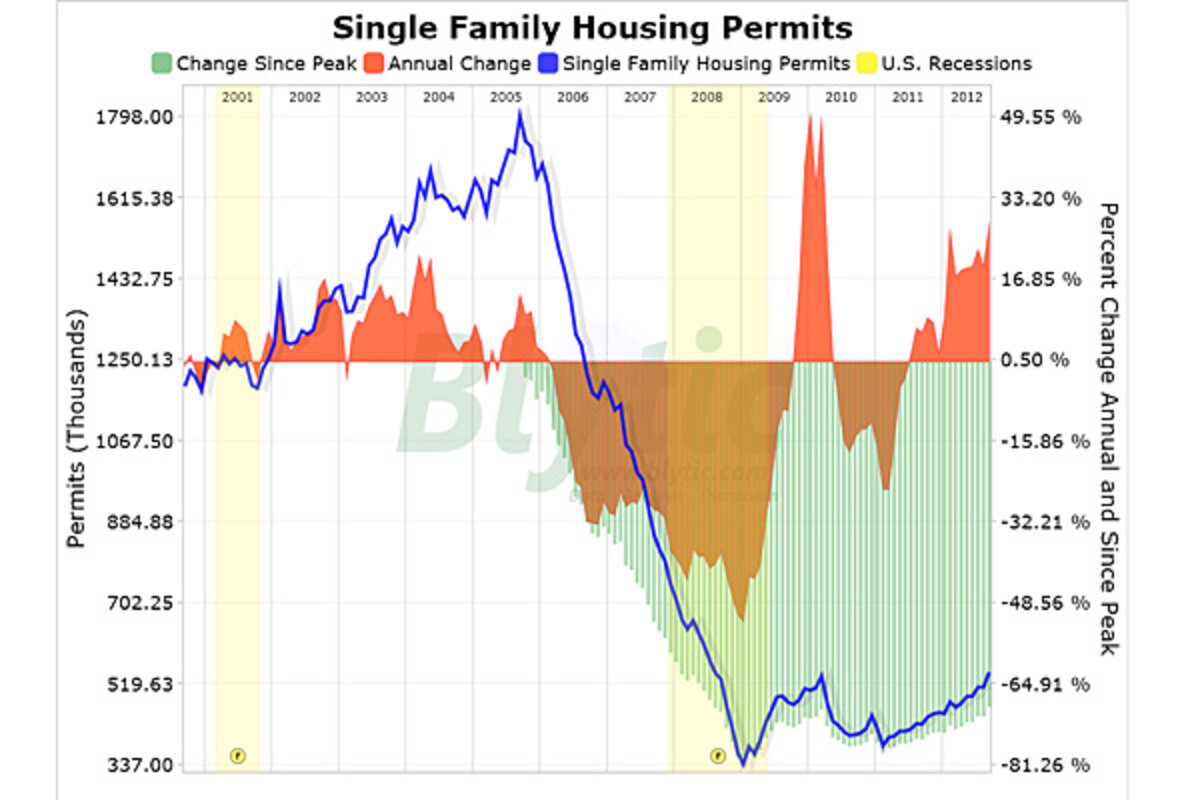 Single family housing permits, the most leading of indicators, jumped 6.7% from August to 545K single family units (SAAR), and increased 27.3% above the level seen in September 2011 but still remained an astonishing 69.7% below the peak in September 2005.聽