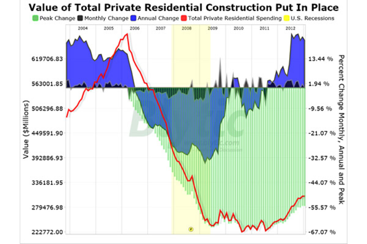 On a month-to-month basis, total residential spending declined 0.02% from December climbing 22.05% above the level seen in January 2012 while still remaining a whopping 54.97% below the peak level seen in 2006.