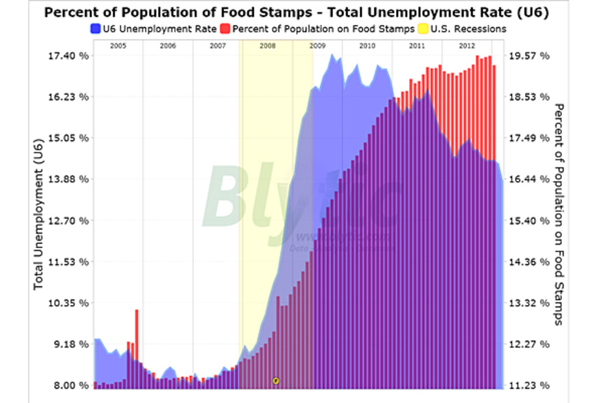Individuals receiving food stamp benefits declined to 47.27 million which, as a ratio of the overall civilian non-institutional population, increased 0.79% since January 2012 to now stand at a whopping 19.32% of the population.