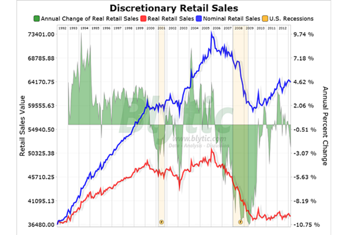 Nominal "discretionary" retail sales including home furnishings, home garden and building materials, consumer electronics and department store sales declined 0.42% from February and slipped 0.64% below the level seen in March 2012 while, adjusting for inflation, 鈥渞eal鈥 discretionary retail sales declined a notable 2.27% over the same period.聽