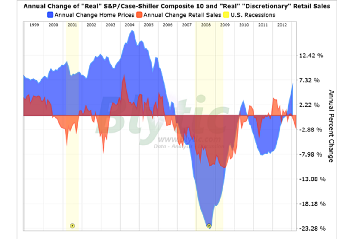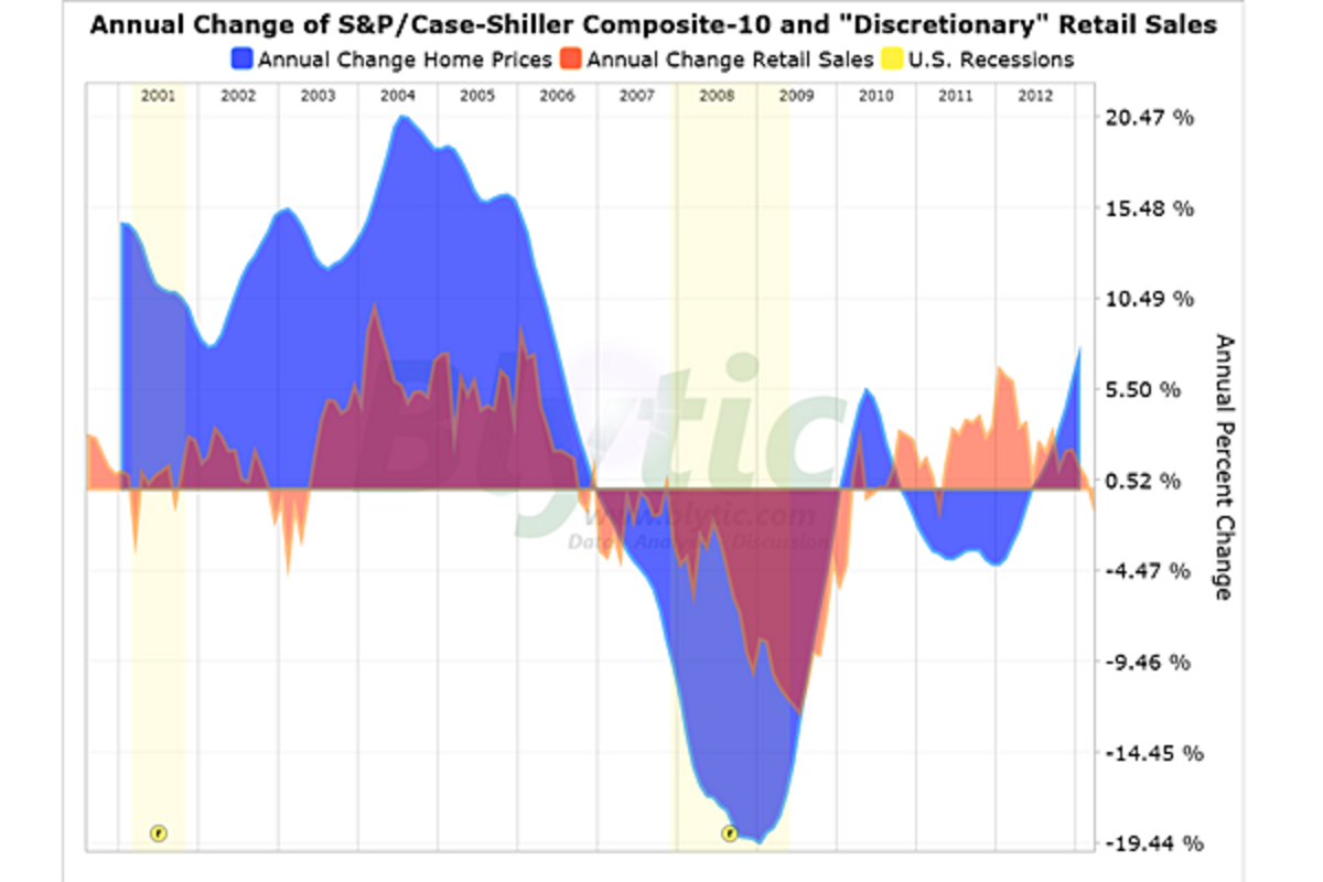 Chart 1 shows the year-over-year change to nominal discretionary retail sales and the year-over-year change to nominal the S&P/Case-Shiller Composite home price index since 1993 and since 2000.聽