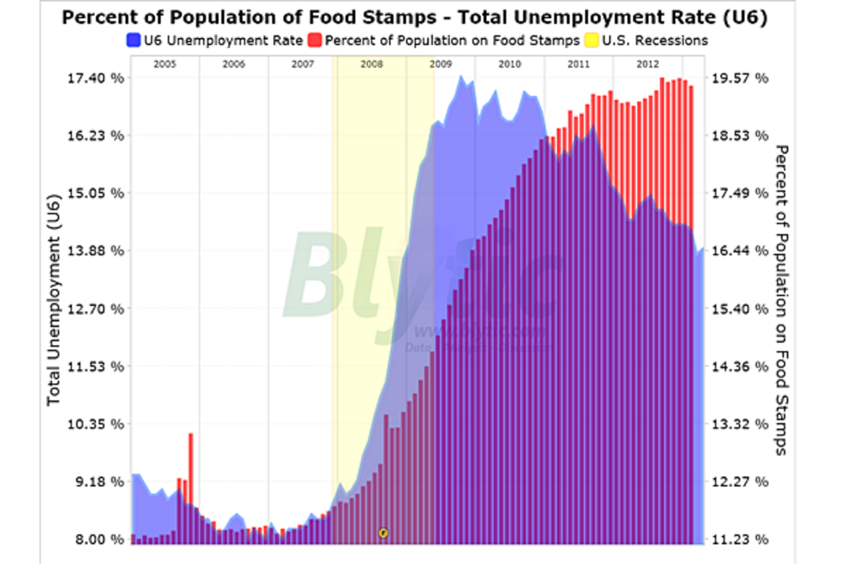 Individuals receiving food stamp benefits declined to 47.55 million which, as a ratio of the overall civilian non-institutional population, declined 1.66% since February 2012 to now stand at a whopping 19.42% of the population.