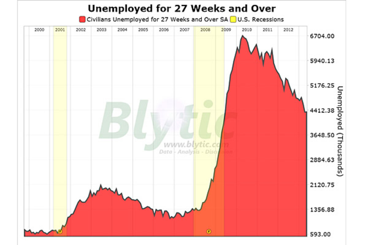 Workers unemployed 27 weeks or more increased to 4.357 million or 37.3% of all unemployed workers while the median term of unemployment declined to 17.3 weeks and the average stay on unemployment increased to 36.9 weeks.
