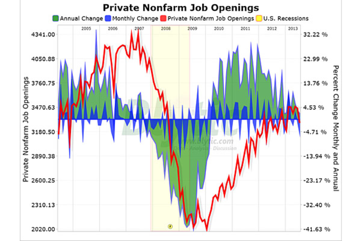 Today, the Bureau of Labor Statistics released theirof job availability and labor turnover (JOLT) showing that private non-farm job 鈥渙penings鈥 declined 5.06% since June but remained 2.27% above the level seen in July 2012 while private non-farm job 鈥渉ires鈥 rose 2.40% from June remaining 3.61% above the level seen in July 2012.