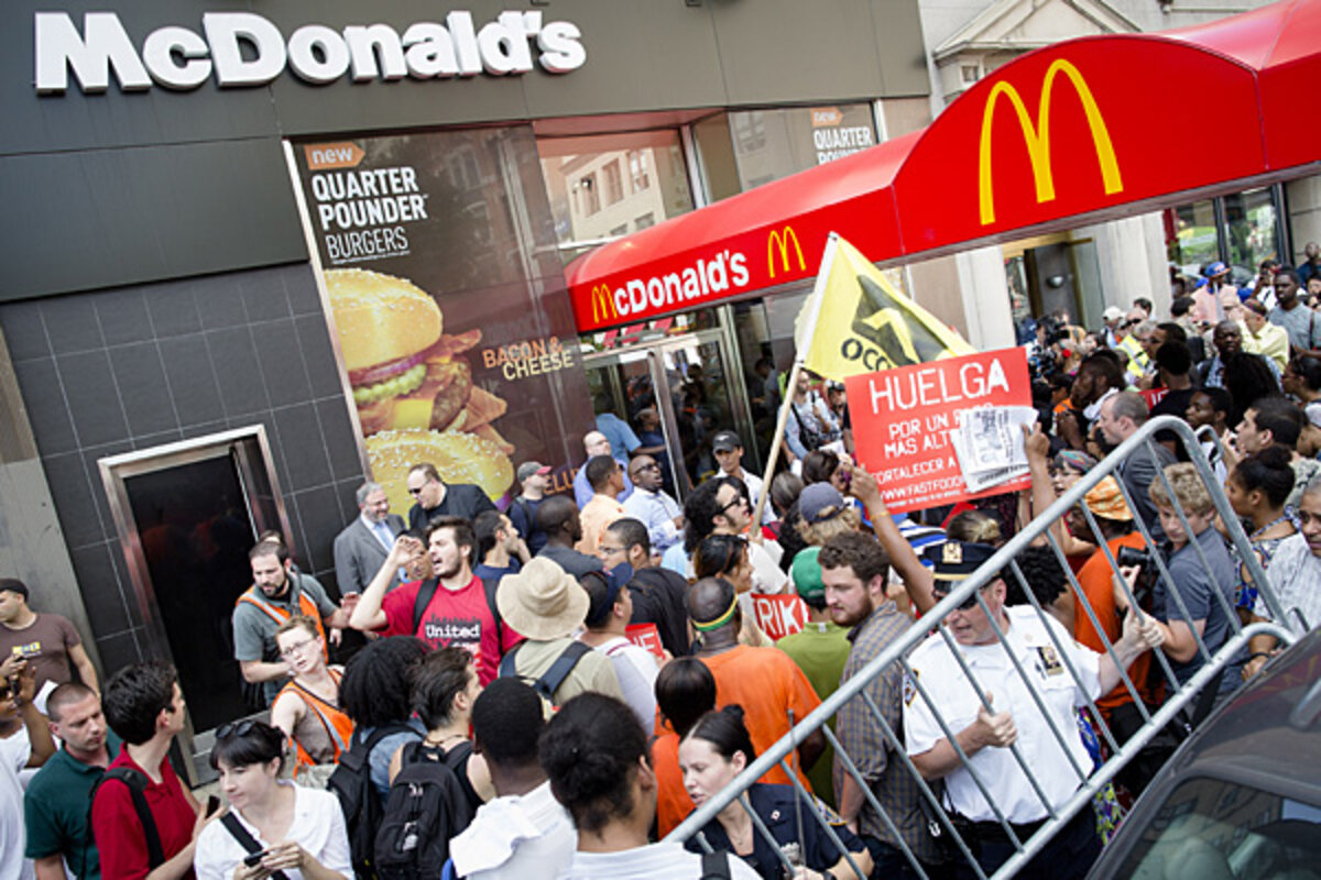 听All of which gives some context to the strikes in recent weeks at fast-food chain stores, such as McDonalds, where workers are demanding a raise to $15-an-hour from their current pay of $8 to $10 an hour.