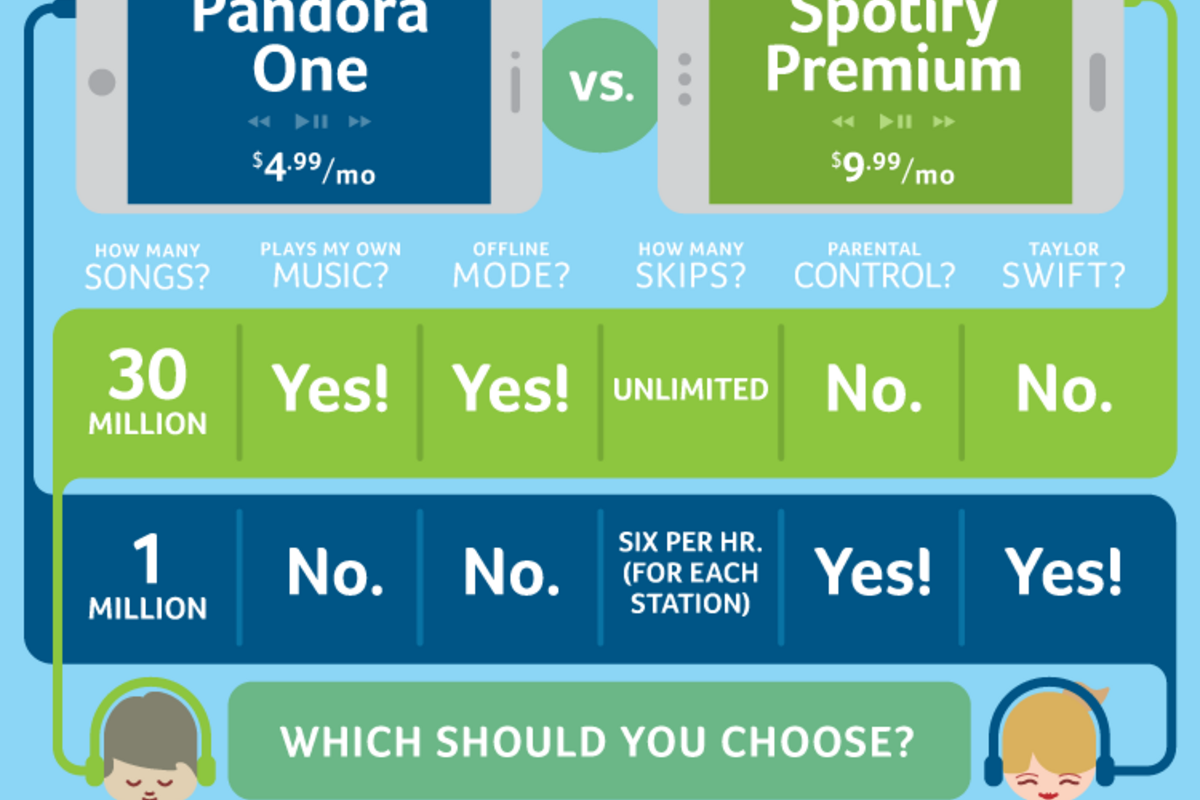 If not being able to stream 鈥1989鈥 and the extra $5 per month aren鈥檛 deal breakers, Spotify is a better bet. But if you鈥檙e still not sure, you can sign up for free trials of both Pandora One and Spotify Premium. And you can always use both without paying 鈥 though you鈥檒l be stuck with ads until you buy a subscription.