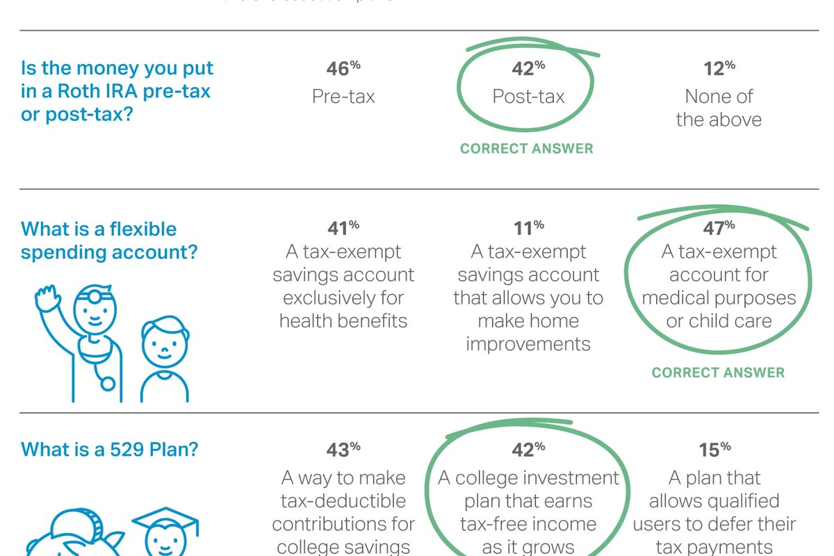 Another question that threw respondents for a loop was related to health care and day care tax benefits. With the stratospheric rise in both health care and day care costs, Americans should be more familiar with flexible spending accounts, or FSAs, says Andrew Fitch, a senior health analyst for NerdWallet.