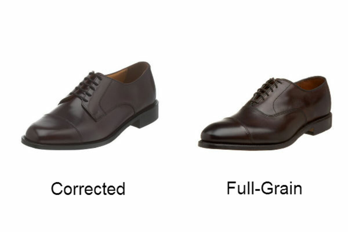 However, the easiest way to tell might be to look up the shoes online. High-end manufacturers won't hesitate to tell you that they use full-grain leather (the same goes for construction, below). Shoes of corrected leather will just say "leather," or might try to use catchwords like "genuine" or "top-grain."