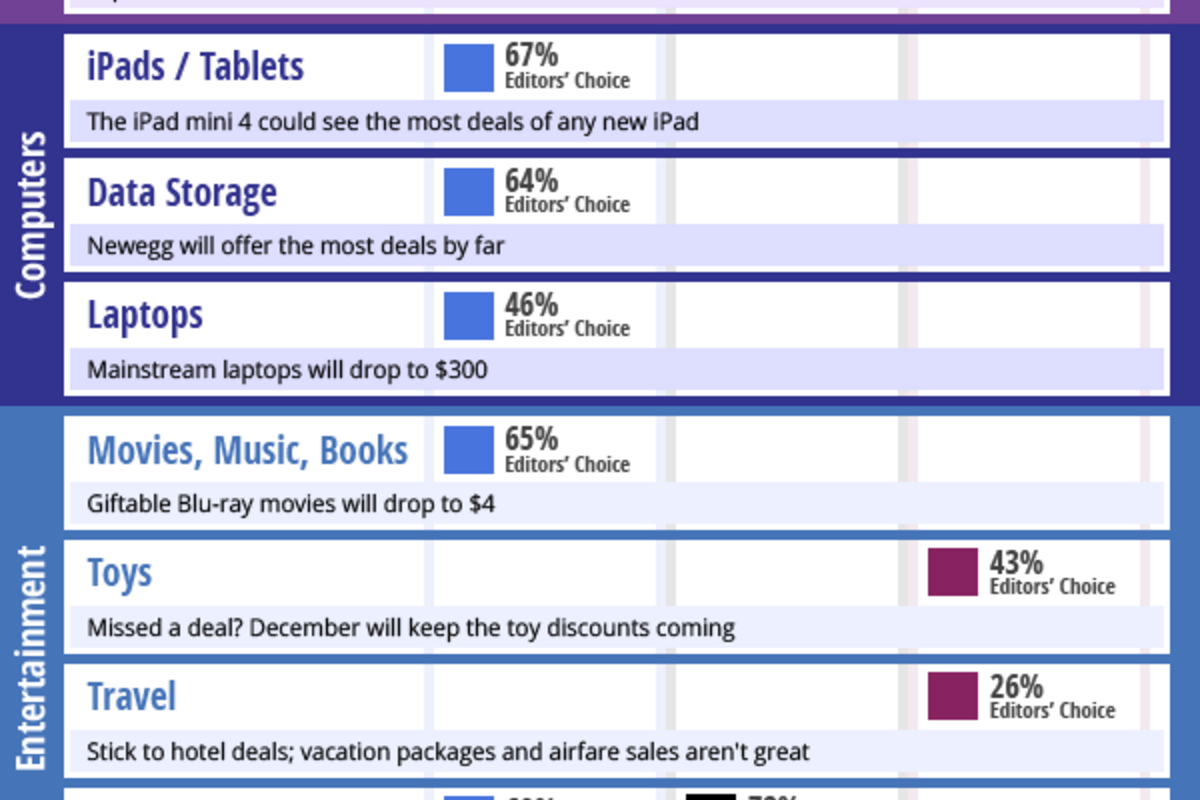 We can't stress this enough: If you can only shop on one day this year, go shopping on Thanksgiving. Of all the product categories listed above, half show a higher concentration of Editors' Choice deals on Turkey Day. This is especially true in the big-ticket electronics categories, where everything from TVs to iPads sees steep discounts. In fact, about 41% of all the deals we listed on Thanksgiving last year were hot enough to be marked Editors' Choice.