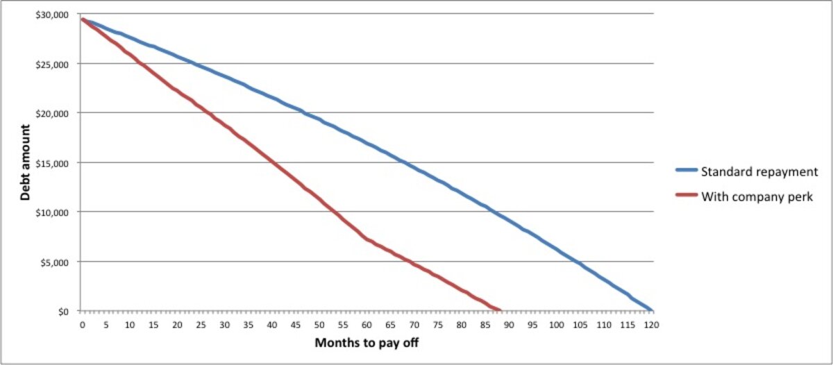 The following chart illustrates聽how much more quickly these graduates聽can pay聽off their student loans聽by using this new company perk, as opposed to sticking with the standard term.