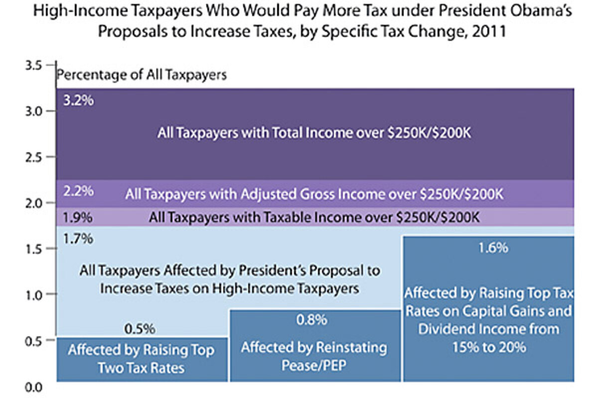But Obama鈥檚 budget plan is even a bit more generous than that. To make sure that no one making less than $200,000 really does get hit with a tax increase, the president had to to cover more income. That would cut taxes for even the richest taxpayers by a few hundred dollars and provide a small cushion against higher levies for people just over the thresholds. When all the dust settles, the Tax Policy Center figures that just 1.7 percent of households would pay higher taxes under the president鈥檚 proposal than if Congress extended all the 2001 and 2003 tax cuts.