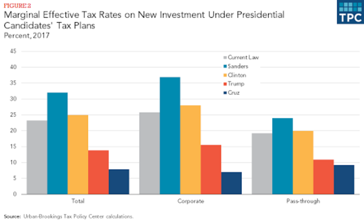 But let鈥檚 leave that problem aside for a moment, and just look at how each plan would tax new investments. TPC does this by calculating the marginal effective tax rates (METR) businesses would pay on their capital purchases, or, to put it another way, 聽the tax to the returns of a break-even investment. The third remaining GOP candidate, John Kasich, has not yet specified his plan in enough detail for TPC to model.