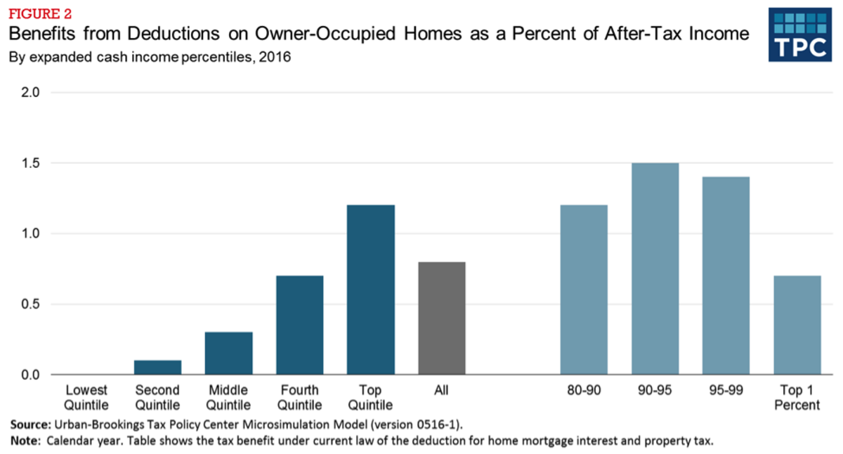 The value of these subsidies also rises with income. The lowest-income 20 percent of households will effectively get no benefit from the deductions for property taxes and mortgage interest. Middle-income households will see an average tax cut of $170, or 0.3 percent of their after-tax income. In contrast, the top 20 percent of the income distribution receives an average benefit of 1.2 percent of after-tax income, or about $2,800. The value of these subsidies as a share of after-tax-income declines for the highest income households in part because the mortgage deduction is capped at $1 million and because of other deduction caps in the tax code.